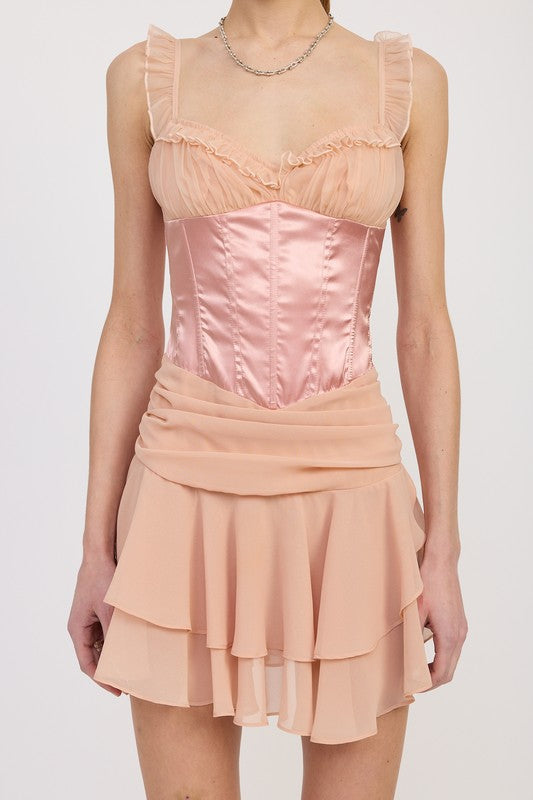 CONTRASTED MINI CORSET DRESS WITH RUFFLE DETAIL