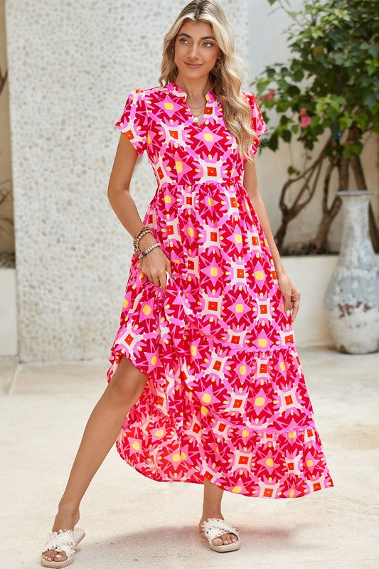 Women Retro Floral Printed Split Neck Maxi Dress