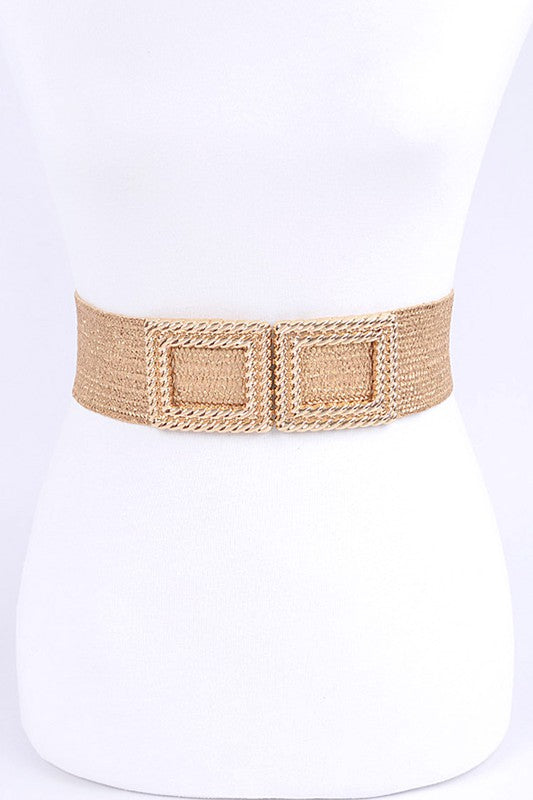 Double Buckle Metallic Faux Straw Elastic Belt