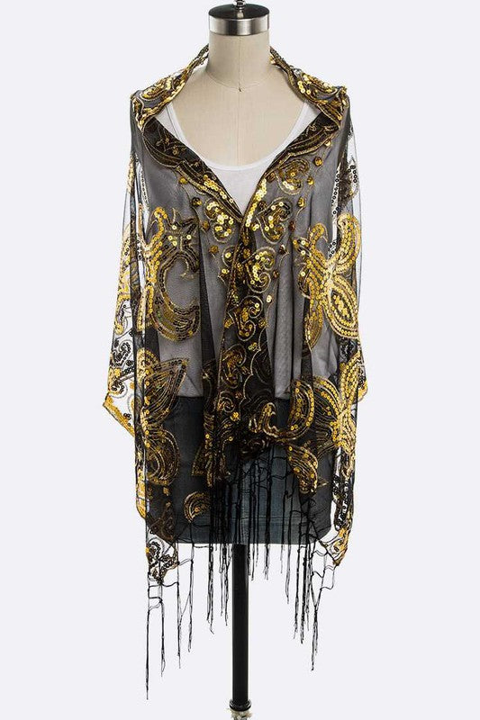 Gold Sequins Fleu De Lis Lace Shawl Scarf