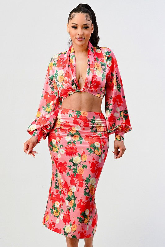 Rose garden long sleeve crop top and skirt set