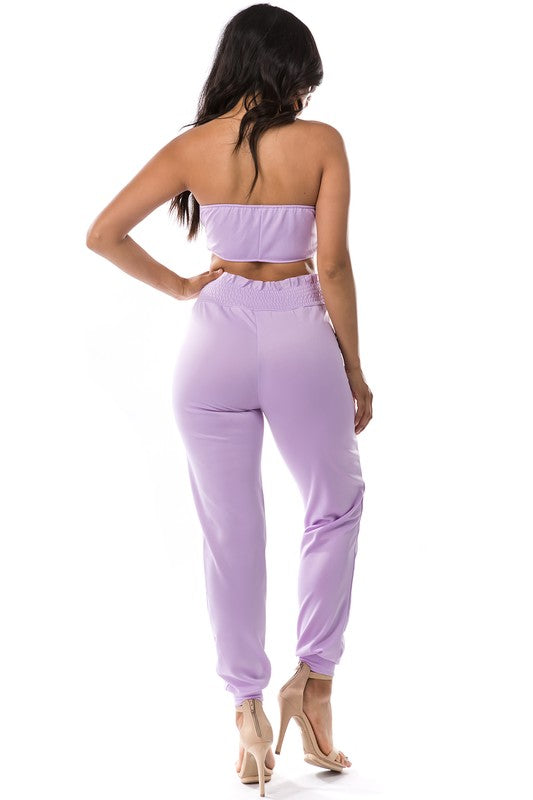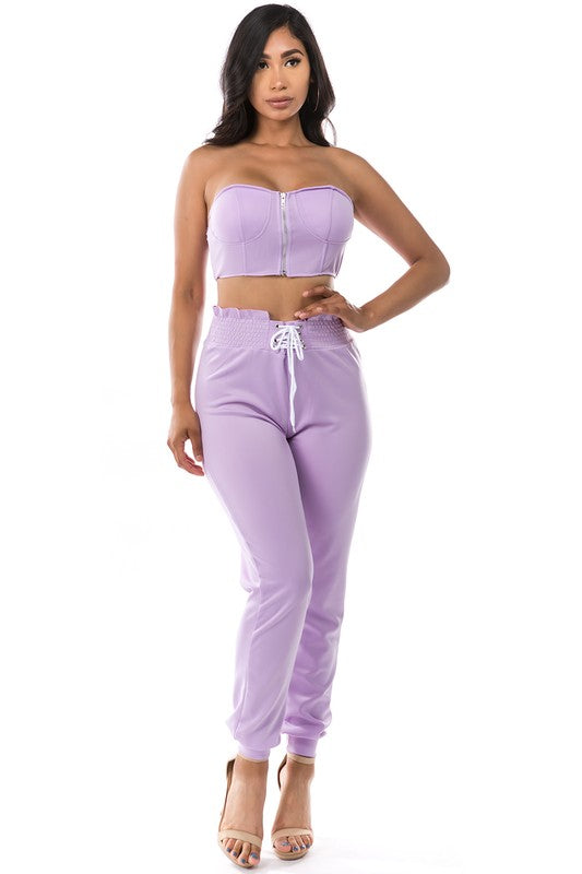 Sexy crop zipper front ,long pant elasticized waist front strip design