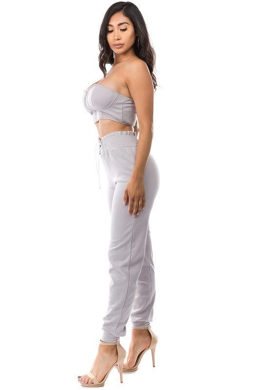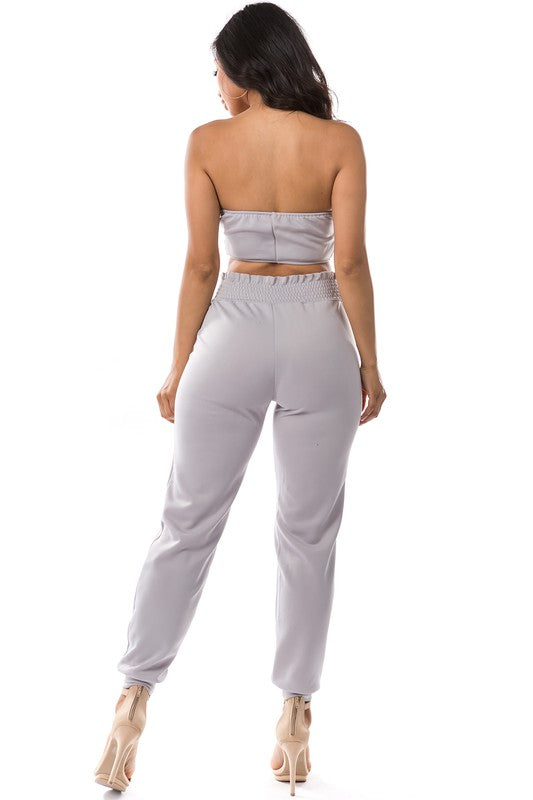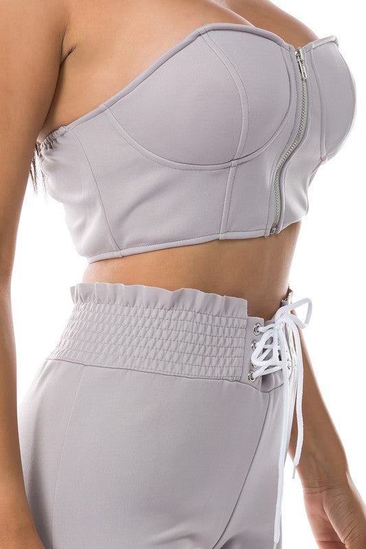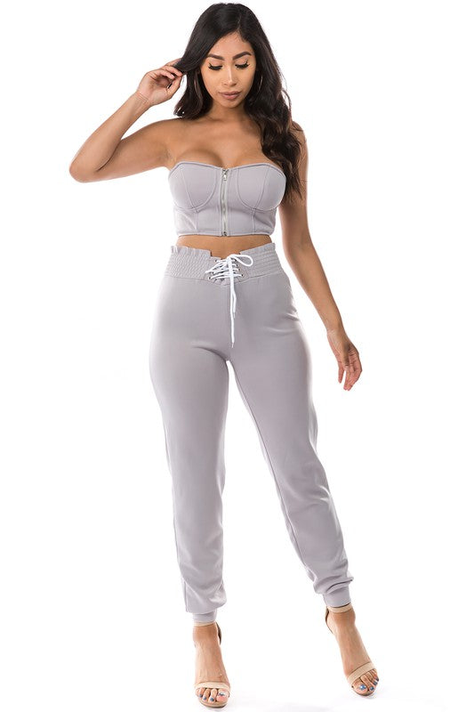 Sexy crop zipper front ,long pant elasticized waist front strip design