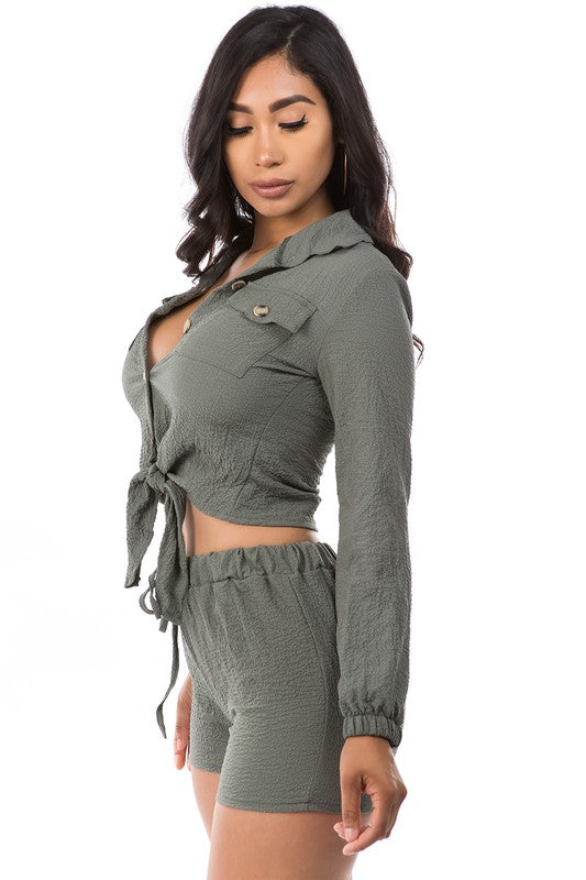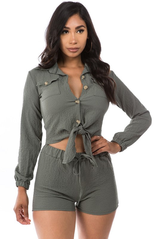 Sexy crop shirt front pocket design ,long sleeve, shorts pant elasticized waist.