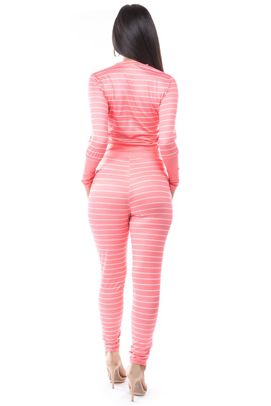 Sexy casual suits multi strip ,round neckline ,long sleeves, ,elasticized waist pant side pocket.