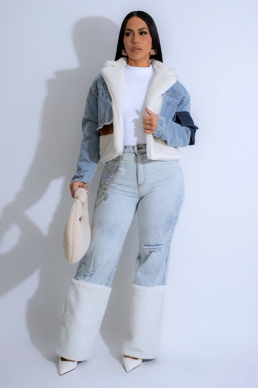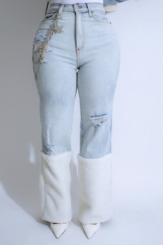 High Rise Wide Leg Jean features ripped detail, front and back pockets, front button and zipper closure, Ice Blue Wash detail, Stretch Denim, Sherpa Hem Detail , Made in usa