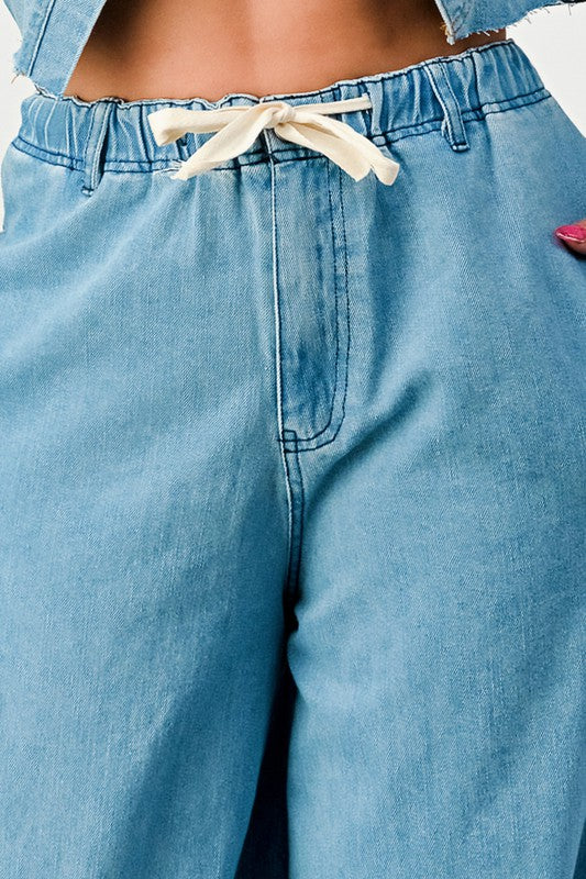 These ATHINA WIDE LEG DENIM PANTS are perfect for a statement-making look. Featuring a blue color, wide leg, high waist, and elastic waistband for comfortable wear, these pants can be worn for day-to-night style.