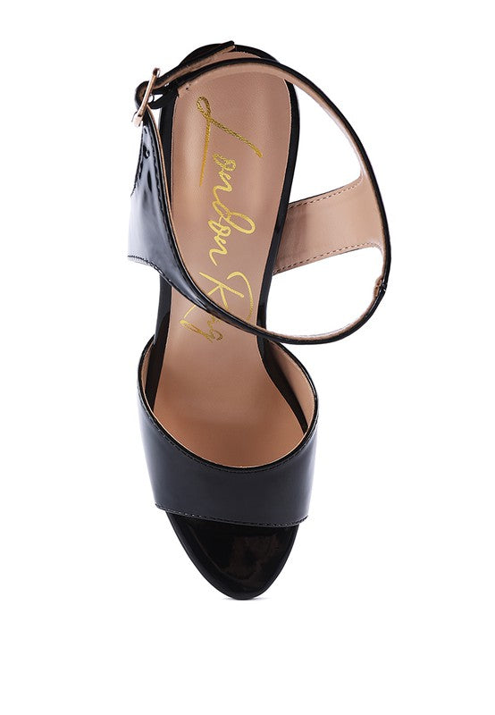 Impactful, bold platform sky high-heels, in patent PU. It has pin buckle ankle fastening detail.