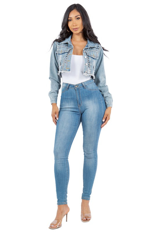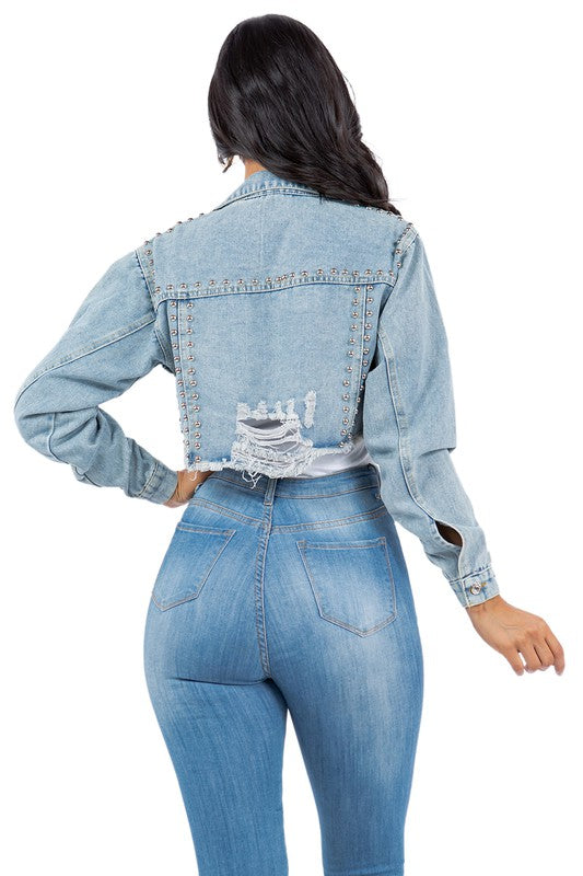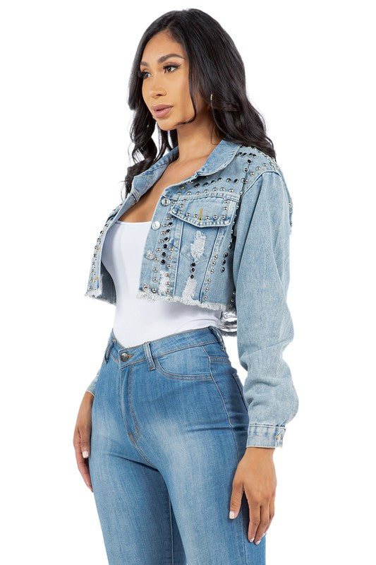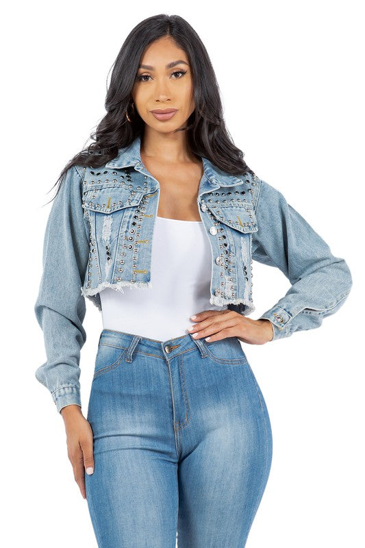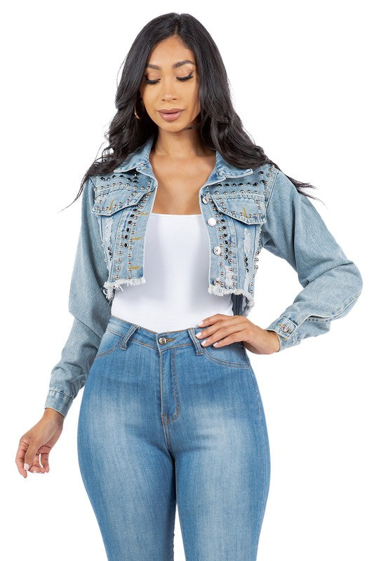 Details-stud all over crop chic jacket, long sleeves, front button