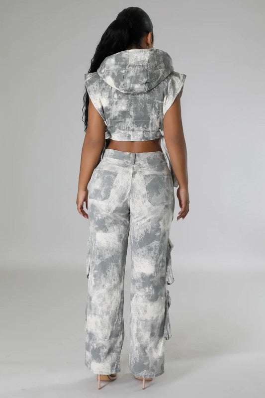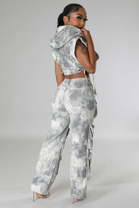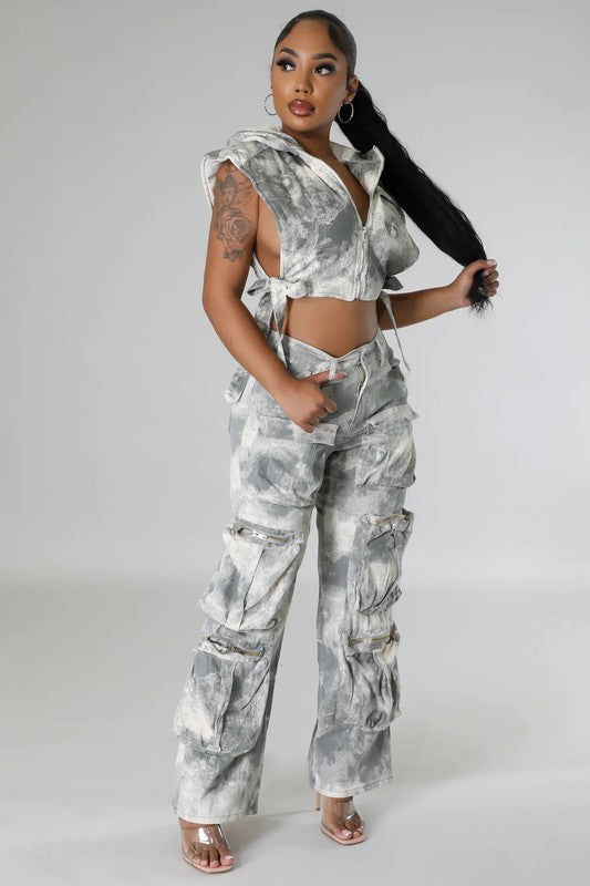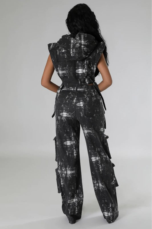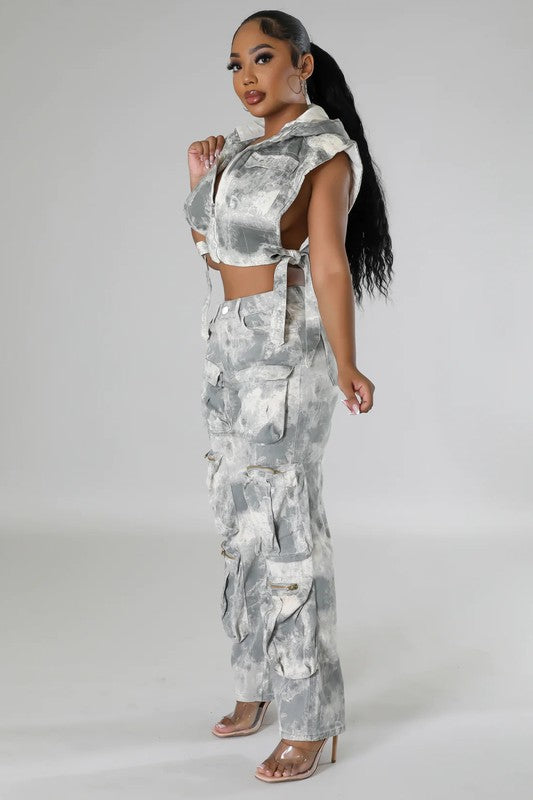 Denim 2pcs set ,Vest denim jacket, sleeveless, front zipper up, side self-strip, belt loops, multi pocket cargo style pants ,high waist