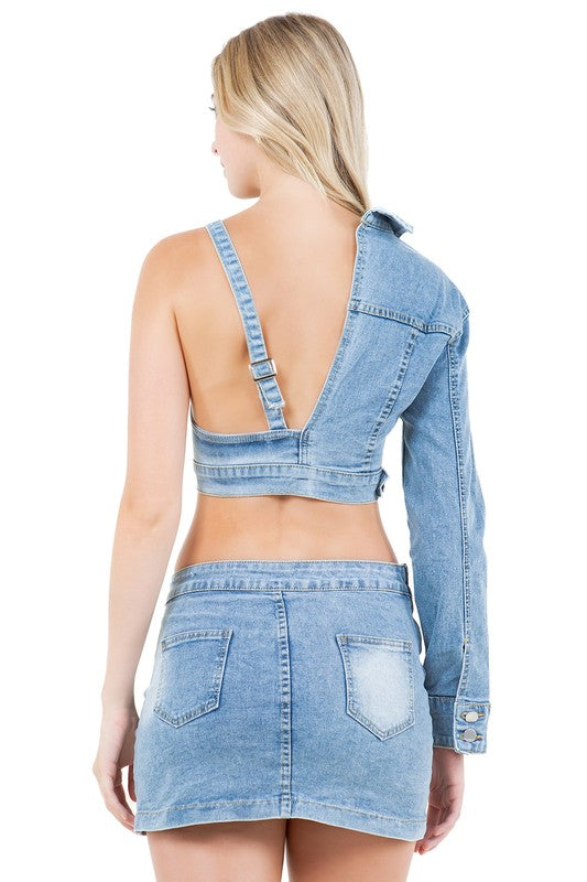 Denim 2pcs set, denim crop top, mini skirt side zipper
