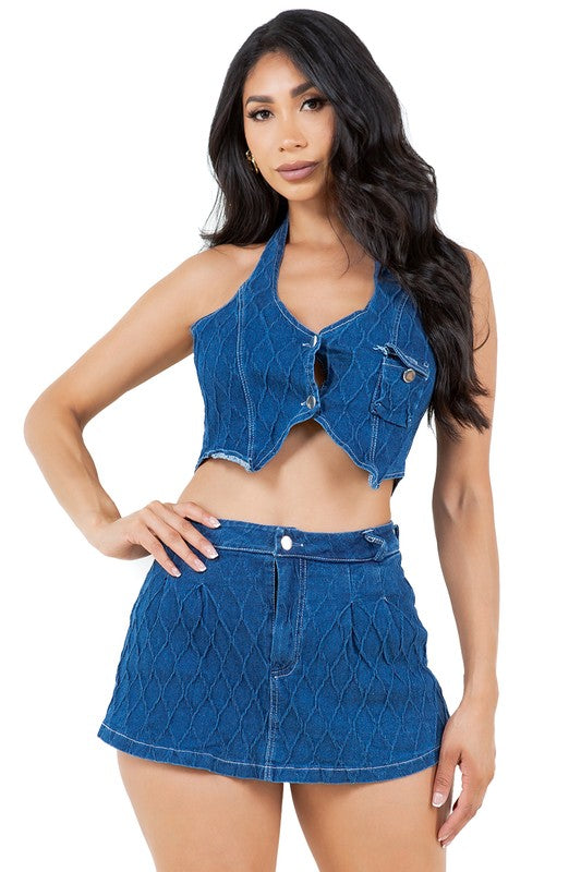 Denim 2pcs set, denim top halter neckline, sleeveless, front button up, belt loops mini skirt short.
