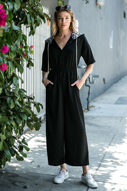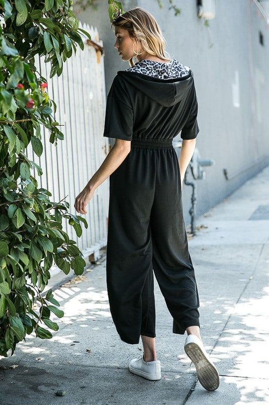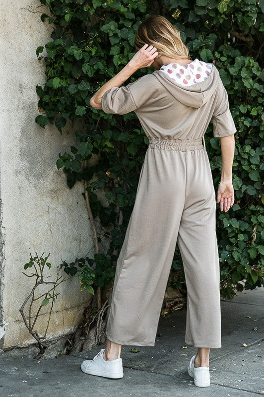 Zip front, crop length jumpsuit has elastic waist with side pockets. Hoodie has contrast print with colorful neck inside binding with hoodie drawstring.