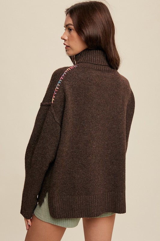 A cozy and stylish addition to your winter wardrobe. This sweater combines comfort with a pop of color, featuring long sleeves, a mock neck, and intricate multi-color stitching detail on the shoulders.