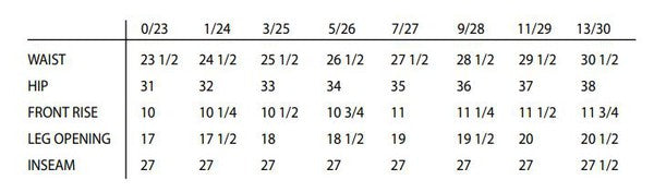 0: 23.5 (Waist), 31.0 (Hips), 27.0 (Inseam), null (Length)
