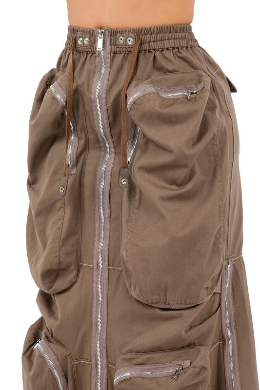 Sexy long maxi skirt ,2 way wear, elasticized waist with snap button change waist, front zipper-up, multi pocket sexy look
