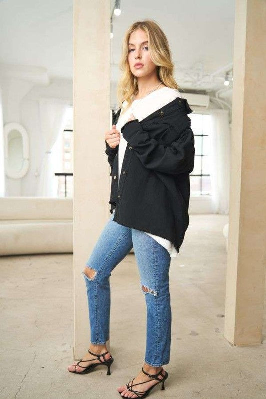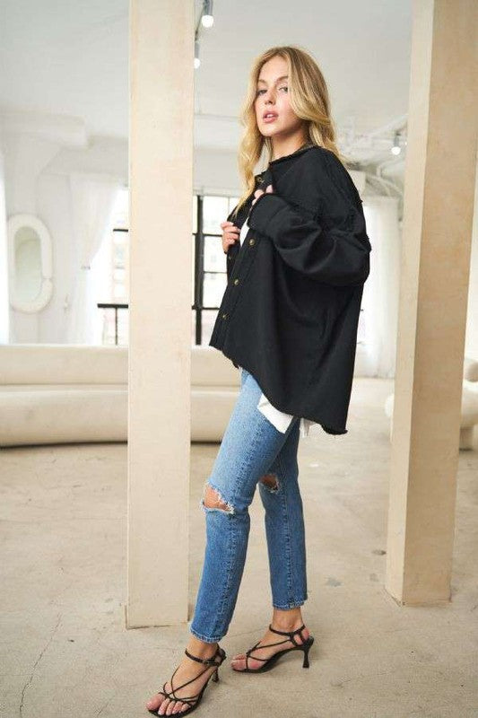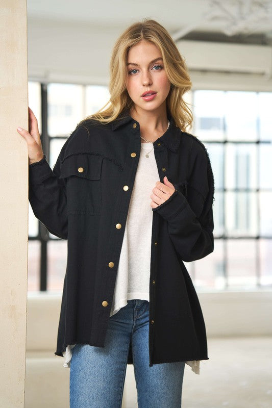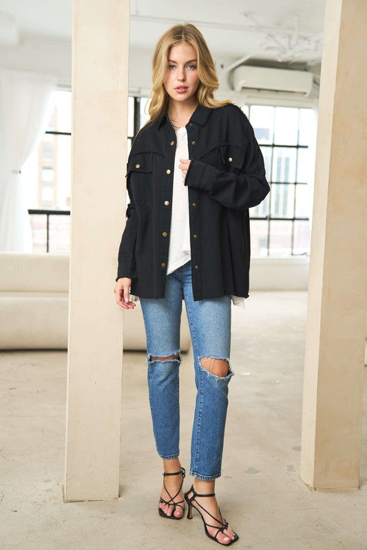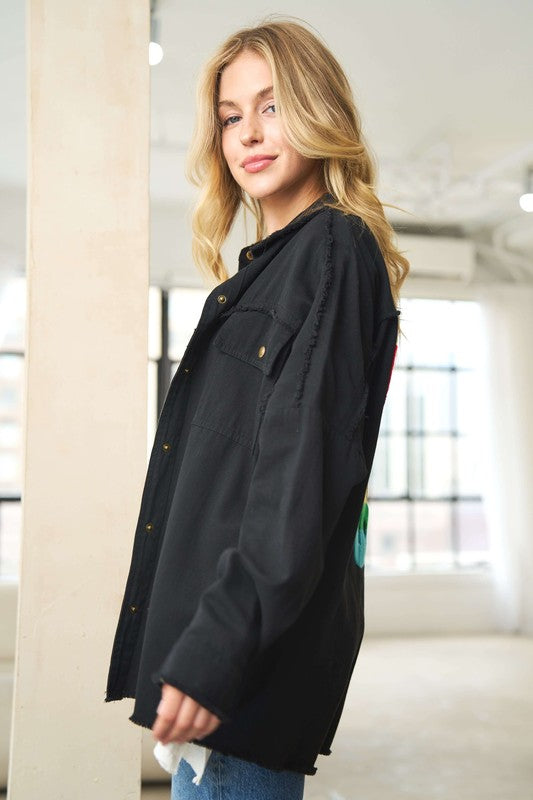 Multi-color lettering peace symbol back fringe hem detail button front shirt top.