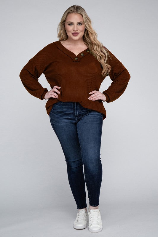 Plus Brushed Waffle V-Neck Button Detail Sweater