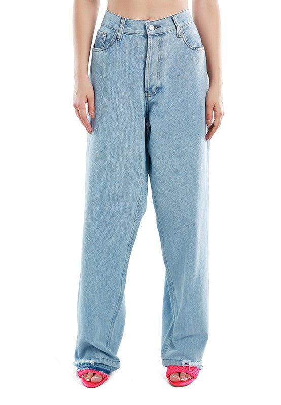 Definition of business at the font and party on the back. Get this wide legged denim trousers that features a bold ripped detail on the back. The trousers are high waisted for utmost comfort when worn. To add to the casual and cool vibe of the look, the hems are left raw and partly distressed. Pair it with oversized shirts or tshirts to attain the ultimate cool and casual look.