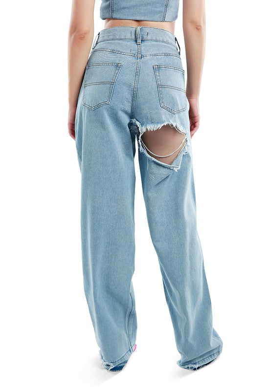 Ripped Wide Leg Denim Trousers