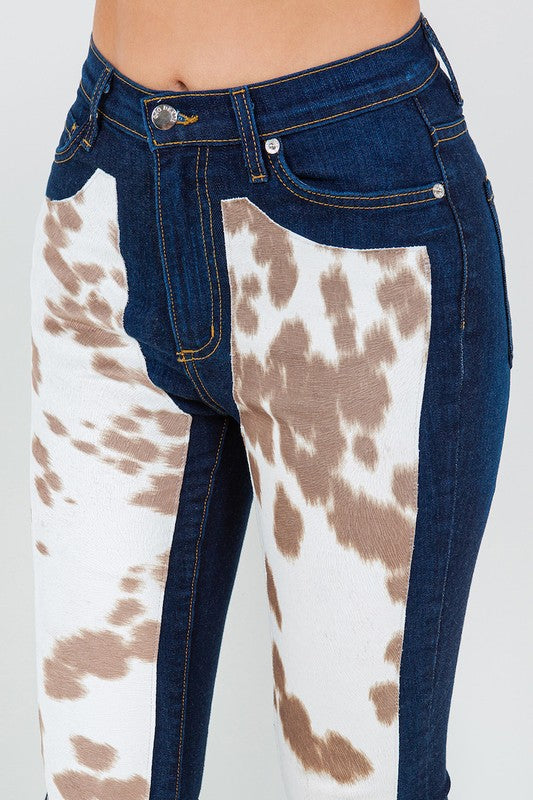 Ride into style with our Rodeo Bell Bottom Jean! These Western-inspired jeans elevate any outfit with front faux cow hide inserts and a flattering 34" inseam length. Made in the USA with stretch denim, they're as comfortable as they are stylish. Moo-ve over, basic jeans!