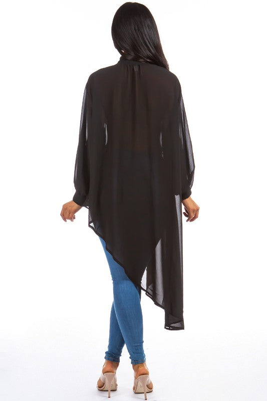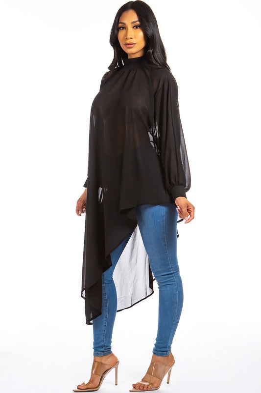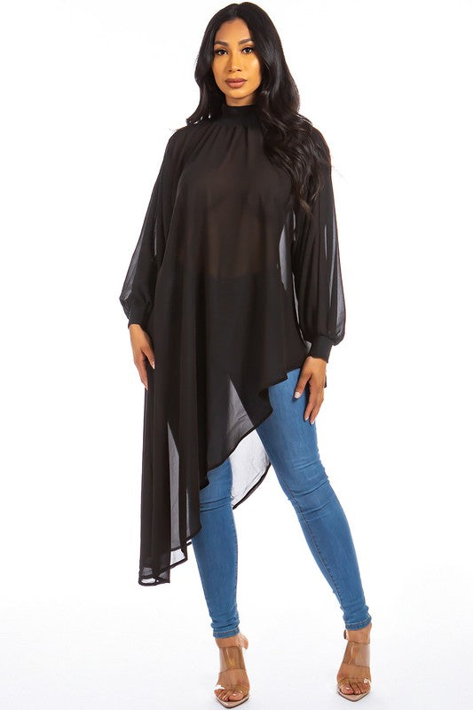 Sexy chiffon top, high neckline, long sleeves, irregularity cut design
