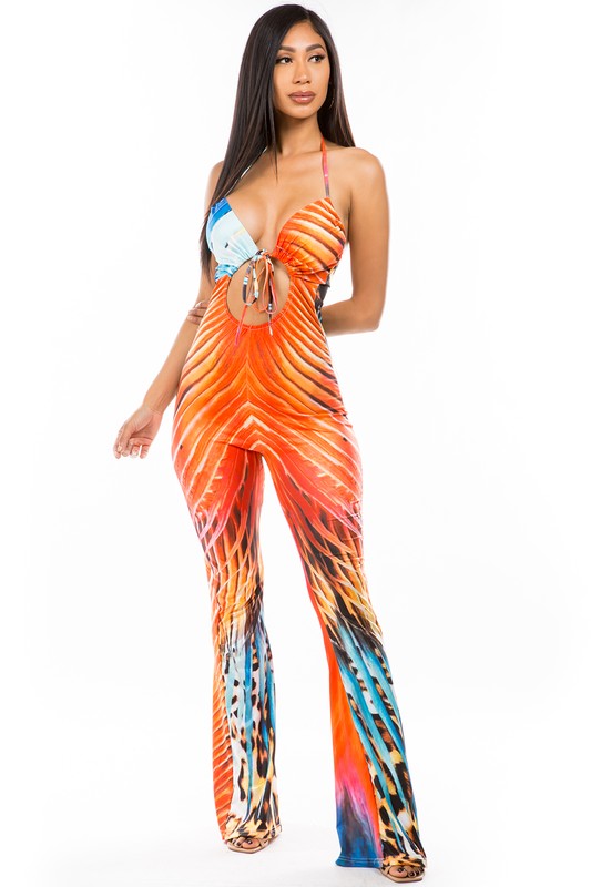 Sexy color block jumpsuit, sleeveless cut off look multi-strip self-tie with long palazzo pant design
