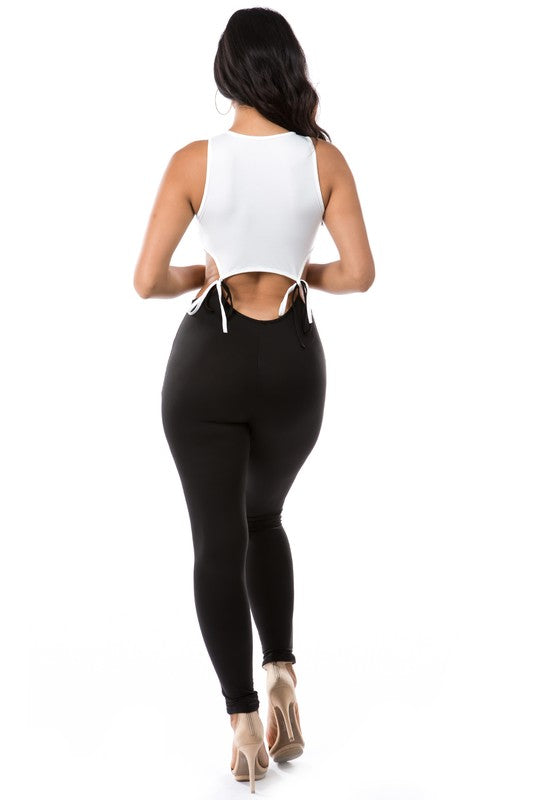 Sexy color block jumpsuit, sleeveless cut off look multi strip self tie with long pant design