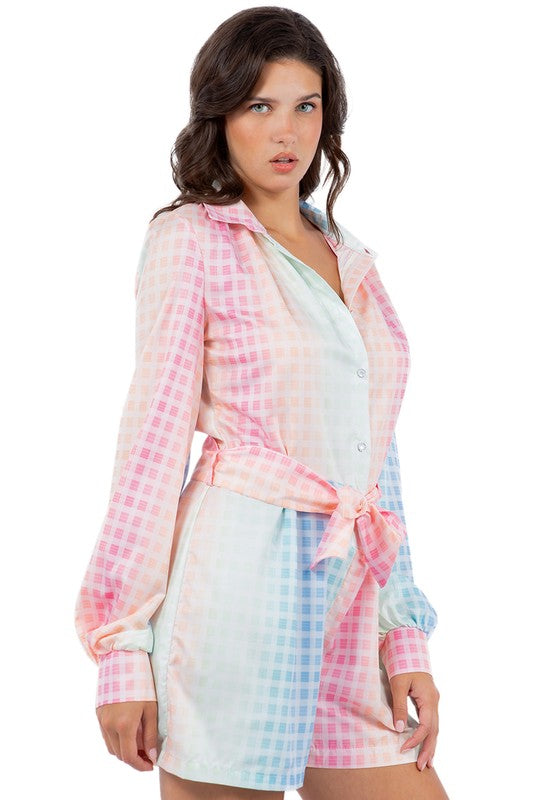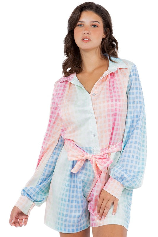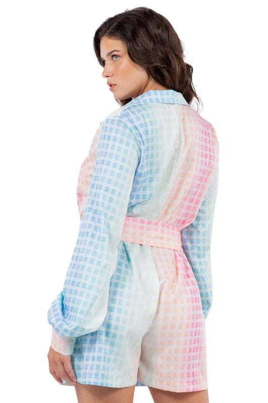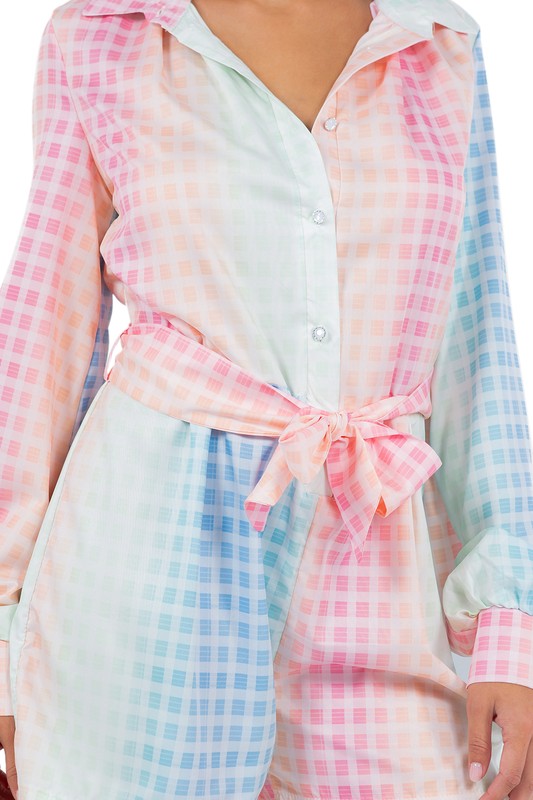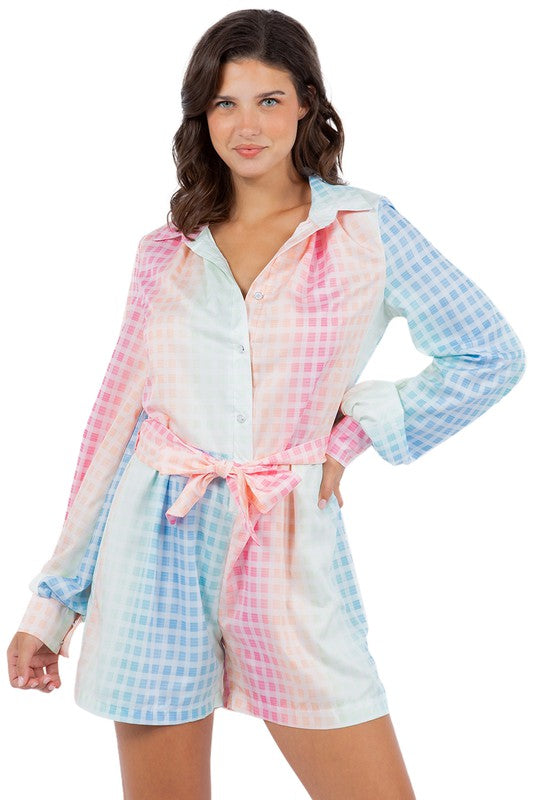 Sexy fashion rompers round neckline, long sleeves, front button up with belt