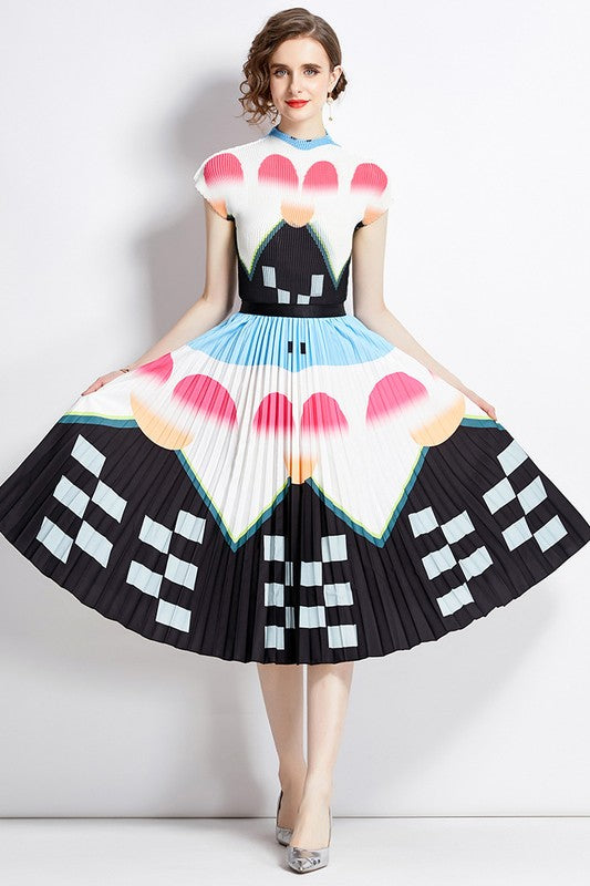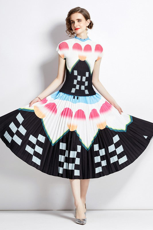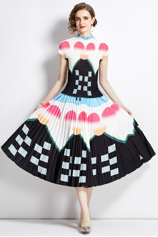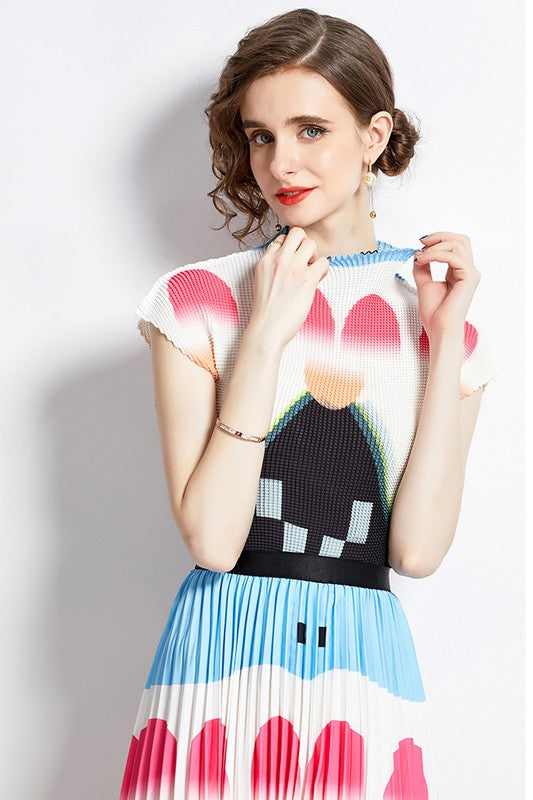 Details-multi print, round neckline, short sleeves, elasticized waist, top and skirt