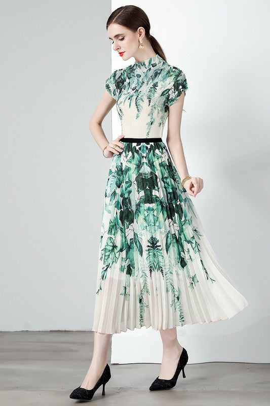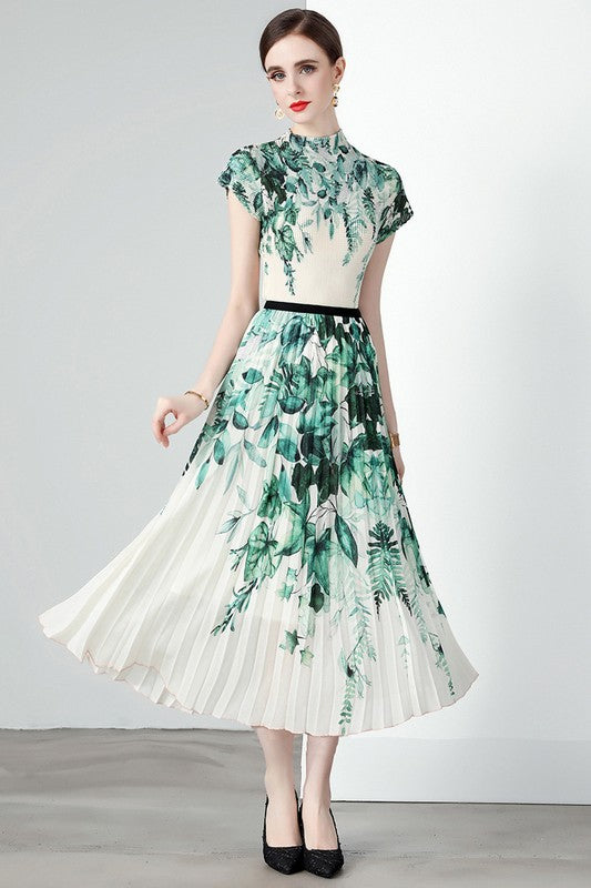 Details-multi print, round neckline, short sleeves, elasticized waist, top and skirt