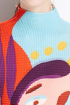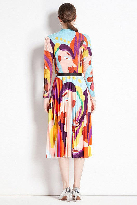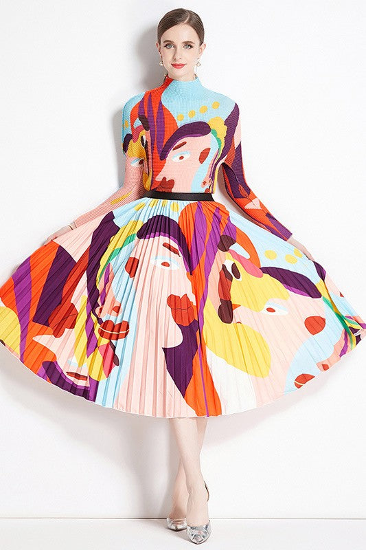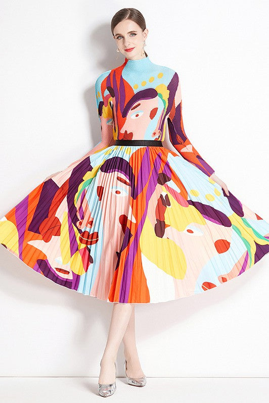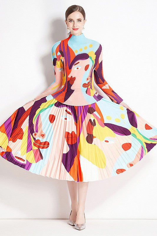 Details-multi print, round neckline, long sleeves, elasticized waist, top and skirt