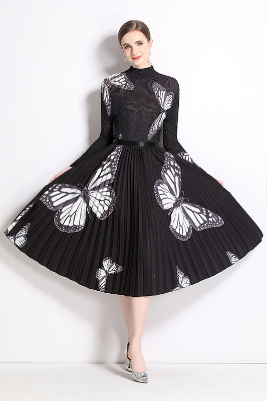 Details-multi print, round neckline, long sleeves, elasticized waist, top and skirt