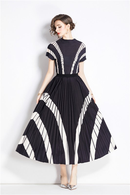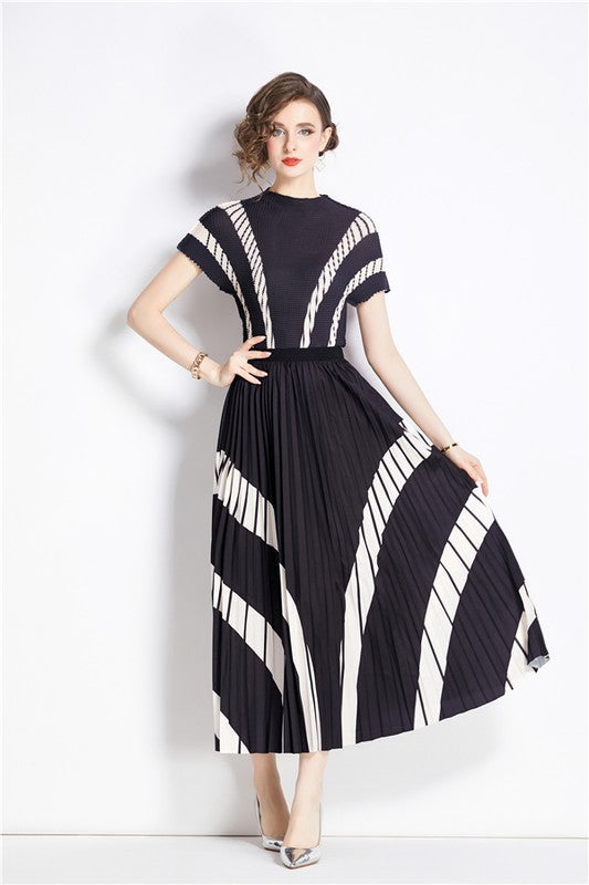 Details-multi print, round neckline, short sleeves, elasticized waist, top and skirt