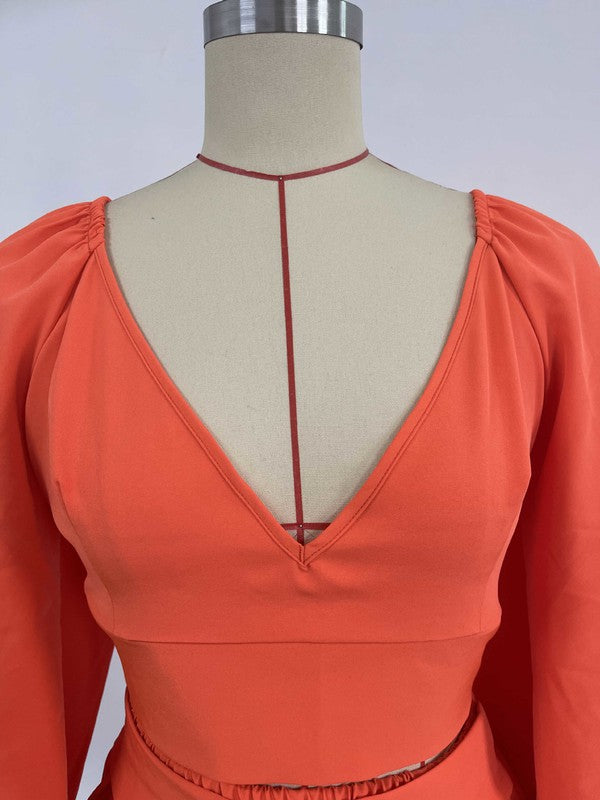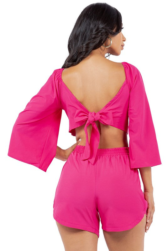 Sexy 2pcs set, 3/4 belt sleeves, V- neckline, open back self strap crop top, elasticized waist short