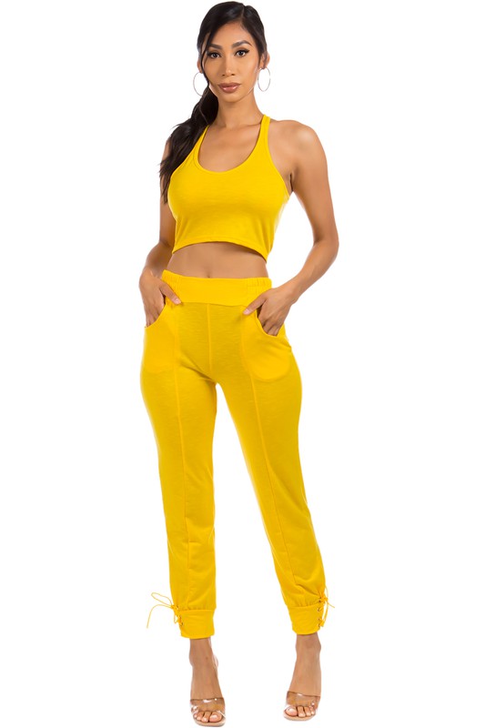 Sexy summer suits, crop top round neckline sleeveless, elasticized waist pant side pocket