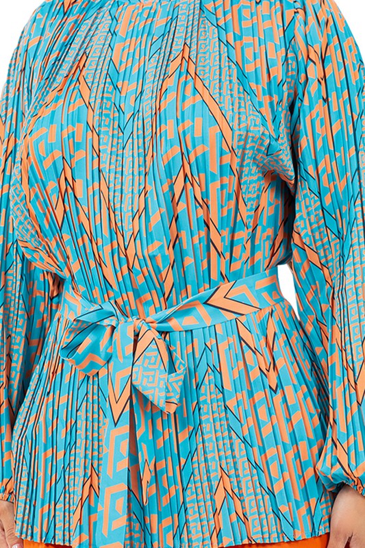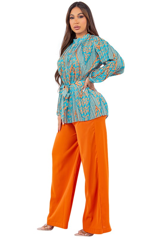 Details- round neckline long sleeves, pleated top design, with belt , high waist wide leg pants with side pocket