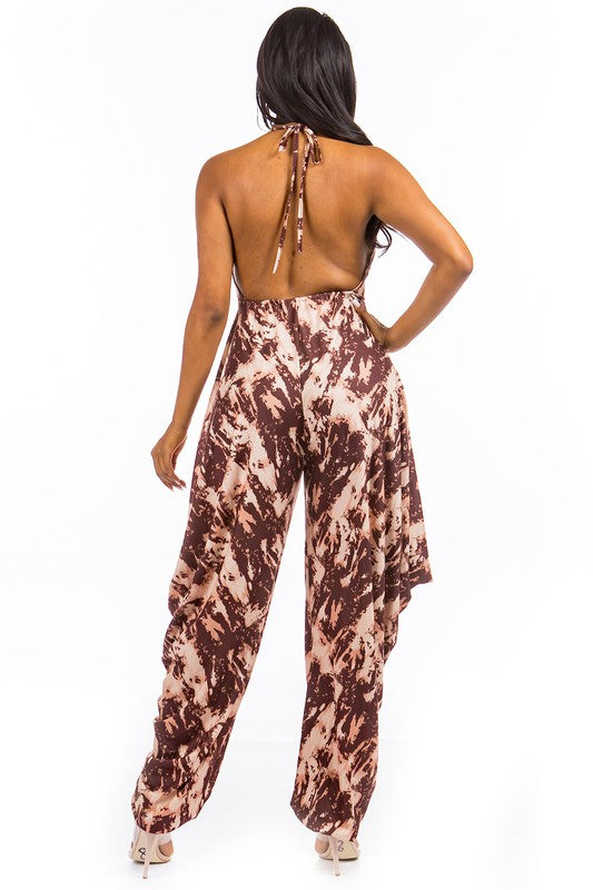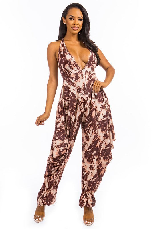 Sexy jumpsuit, deep v-neckline with back strip, sleeveless, open back, hem style pants, elasticized waist