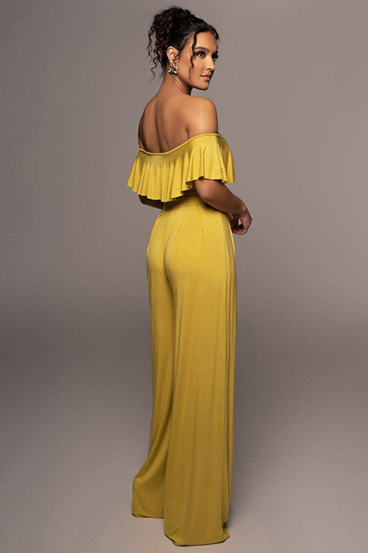 Sexy 2pcs set, off-shoulde, ruffle accent look, elasticized waist pants, side pocket