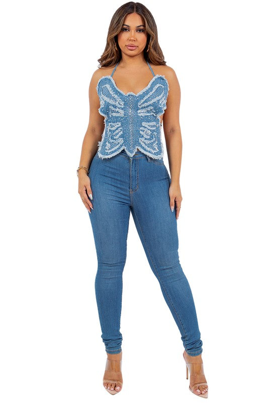Sexy 2pcs set, butterfly pad front back multi strip ,denim short side pocket