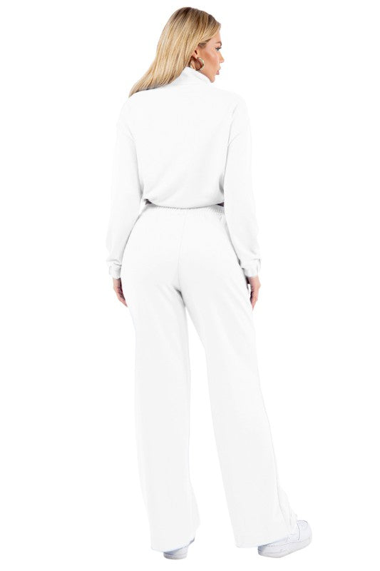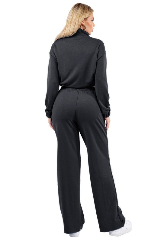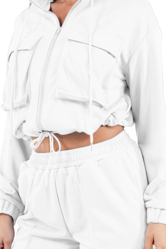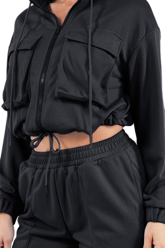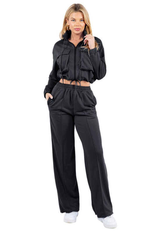 Sexy 2pcs set ,round neckline, long sleeves ,front cargo pockets zipper up, elasticized waist wide leg pants