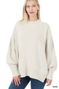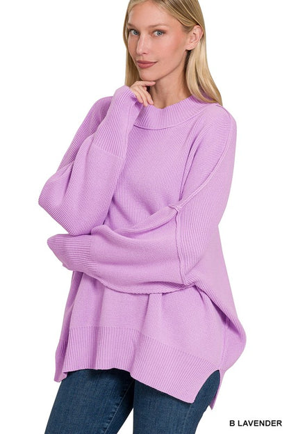 Stay warm and comfortable in this cozy side slit sweater with a mock neckline and soft fabrication. Its oversized silhouette and long sleeves make it perfect for snuggling up on chilly days. With its stylish side slit detail, you'll feel both relaxed and chic in this must-have piece for your wardrobe.