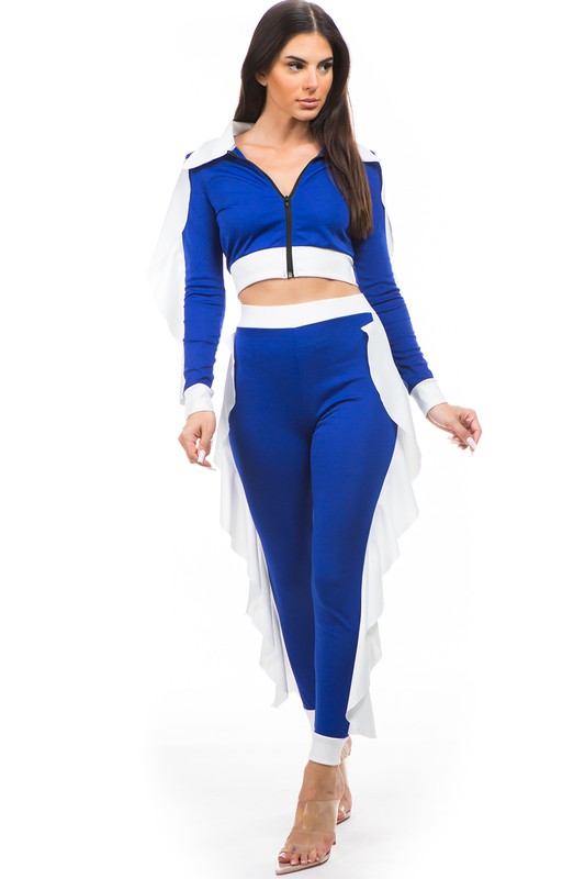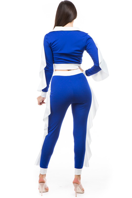 Sexy 2pcs set, collared neckline, long sleeves, front zipper up, elasticized waist pant,side flounce design
