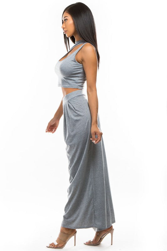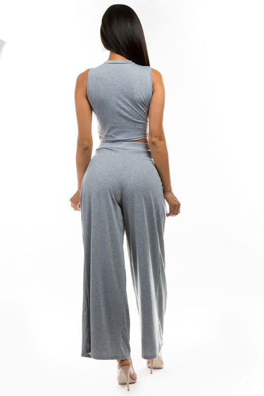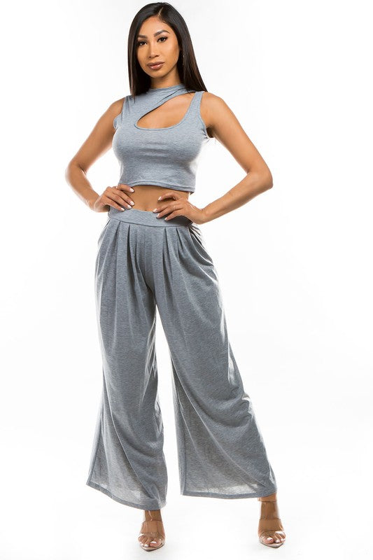 Sexy casual suits, round neckline, sleeveless crop top, elasticized waist bell pant.