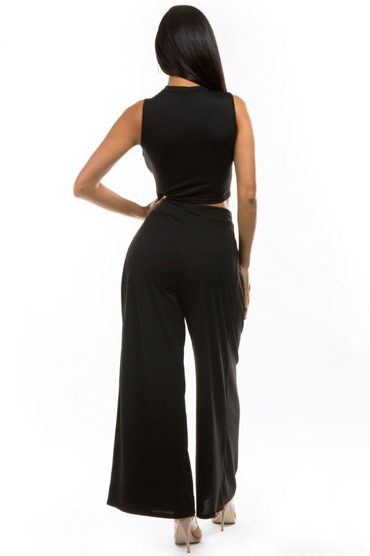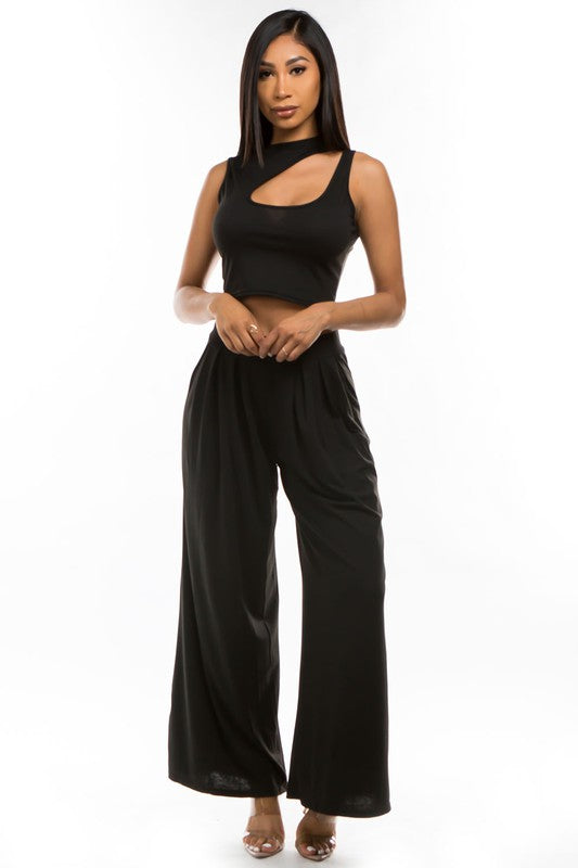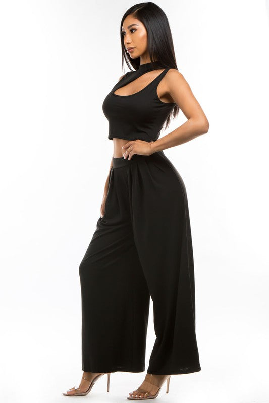Sexy casual suits, round neckline, sleeveless crop top, elasticized waist bell pant.