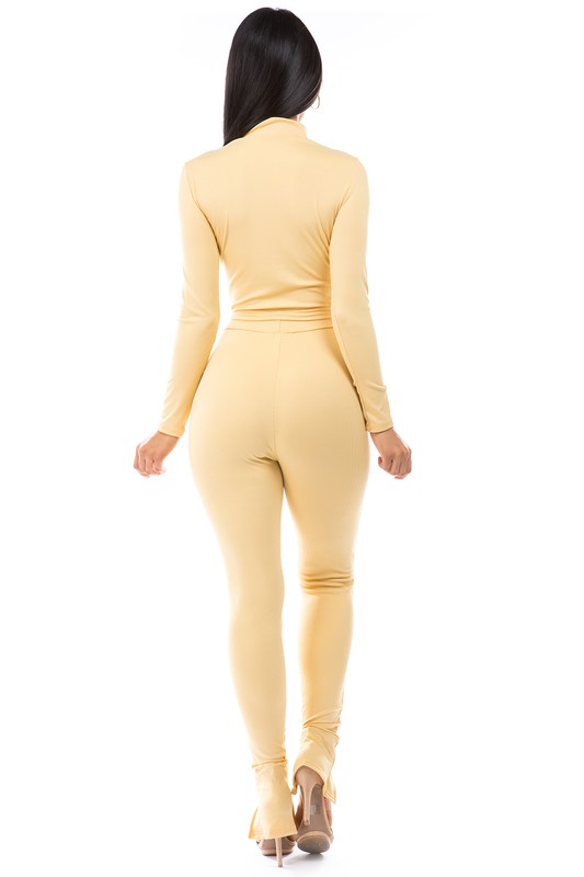 Sexy casual suits ,round neckline ,long sleeves, multi strip front design ,elasticized waist pant cut off look .