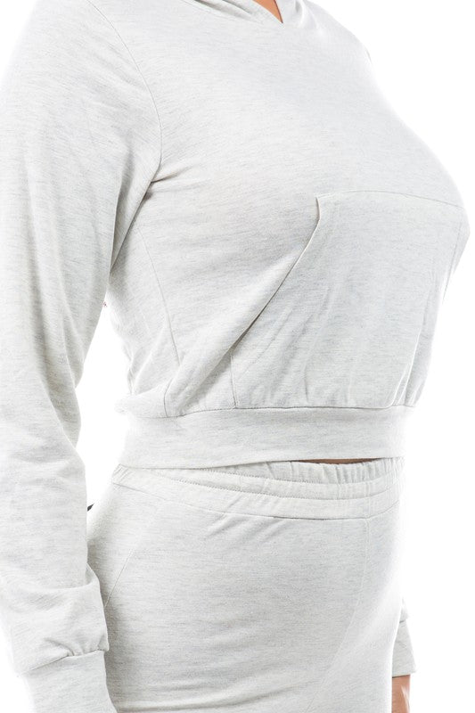 Sexy casual suits ,attached hat ,long sleeves, front pocket ,elasticized waist pant back with strip (self strip )