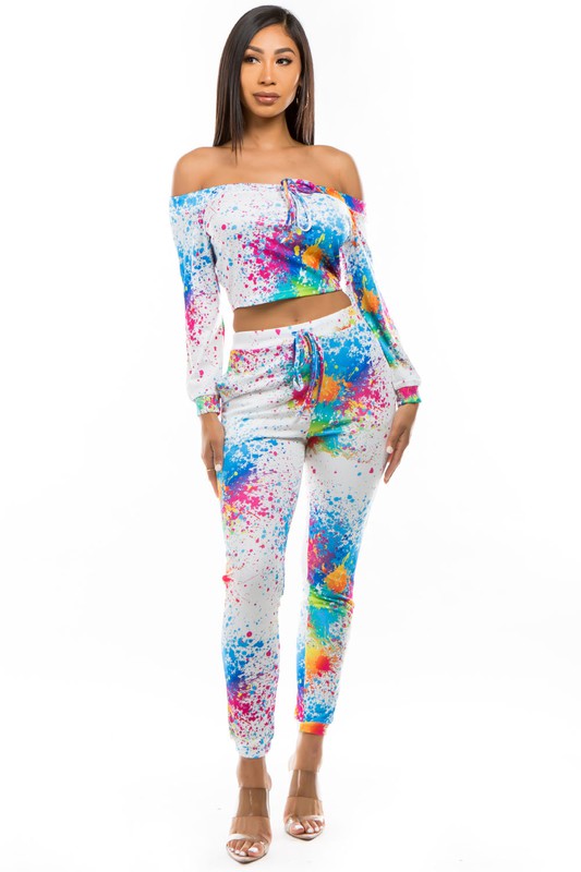 Sexy casual suits, off-the-shoulder look, long sleeves, elasticized waist pant side pocket.