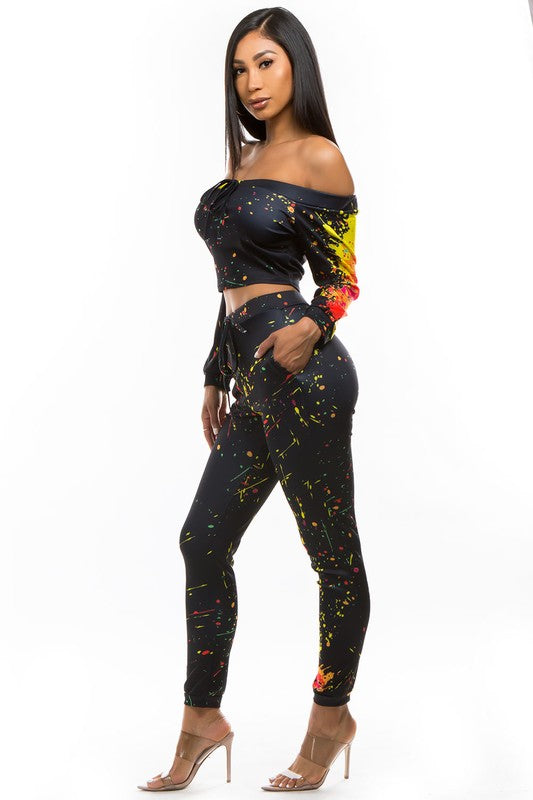 Sexy casual suits, off-the-shoulder look, long sleeves, elasticized waist pant side pocket.