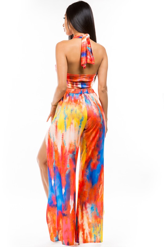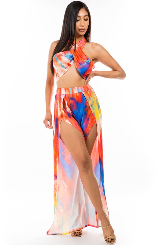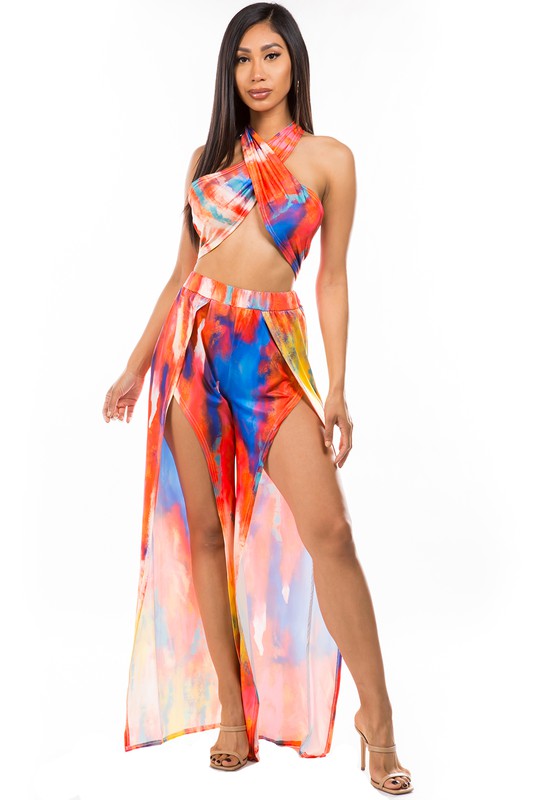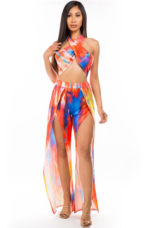 Sexy casual suits, wrap style self strip neck look, elasticized waist pant cut off look